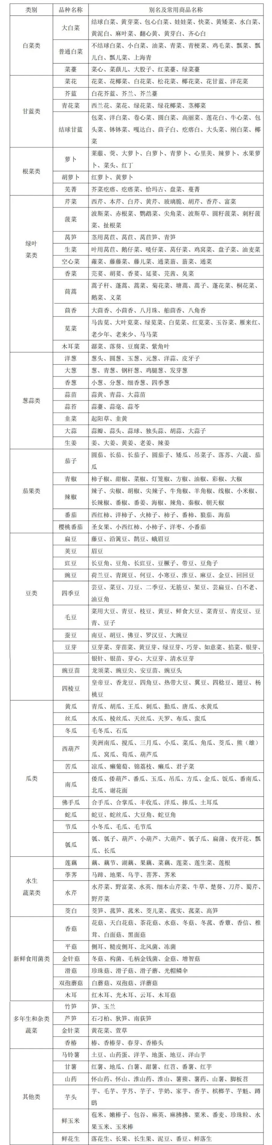 蔬菜别名及常用商品名称对照表